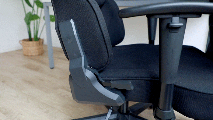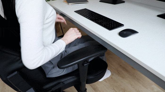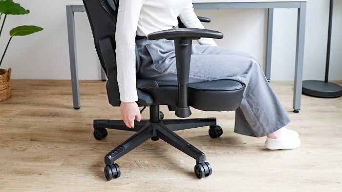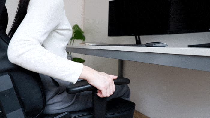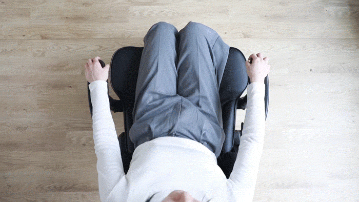高さ・角度が自由自在に調整できる可動式アーム。ハの字に開くことで座面の前方がより広く使えて膝に当たらない、姿勢に合わせたアームの位置に動かせます。