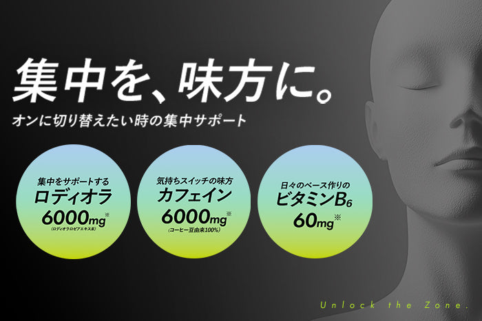 『エナジードリンクに代わる新しい選択肢として、カフェインで気分をオンにするきっかけに、ロディオラでコンディションをキープしやすくなるよう設計されています。そこにビタミンB6を加えることで、仕事や勉強に向き合う時間をサポートするバランスが整っています。』