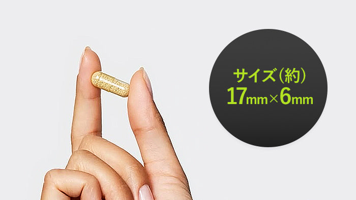 においを抑えるハードカプセル仕様、小さくて飲みやすいカプセルサイズ(約17mm×6mm)です。